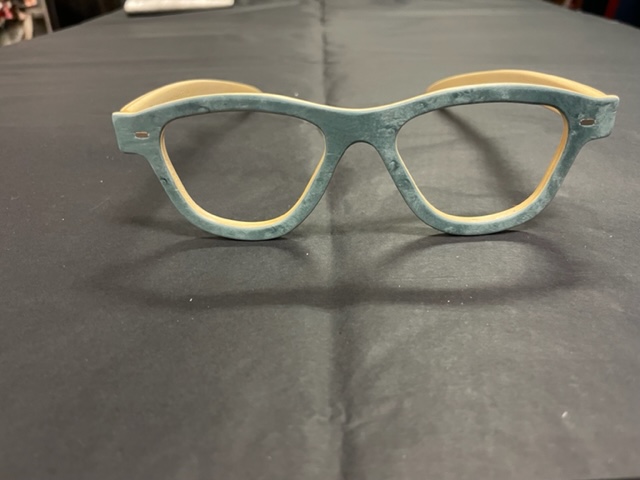 Occhiali in legno fatti interamente a mano, effetto bicolore esternamente turchese pastello.